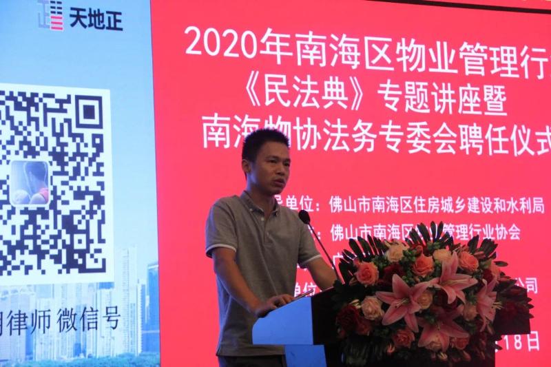 培训讲座后,南海区住建局物业管理科科长刘剑桢作了总结发言,他表示《民法典》与我们的工作、生活息息相关,希望通过本次讲座,大家对《民法典》有更深入的认识,进一步提升行业的物业服务水平,他特别感谢南海物协对此次活动的精心组织以及天地正律师的精彩授课!